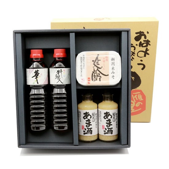 味噌と醤油と甘酒のセットです。 ・新潟米仕込み味噌「延齢」200g ・卓上醤油「華」500ml ・料理用醤油「料理人」500ml ・浮き麹「あま酒」180ml×2