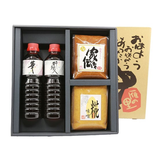 味噌と醤油のセットです。 ・糀みそ 1kg ・家伝みそ 1kg ・卓上醤油「華」500ml ・料理用醤油「料理人」500ml