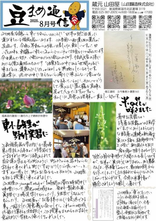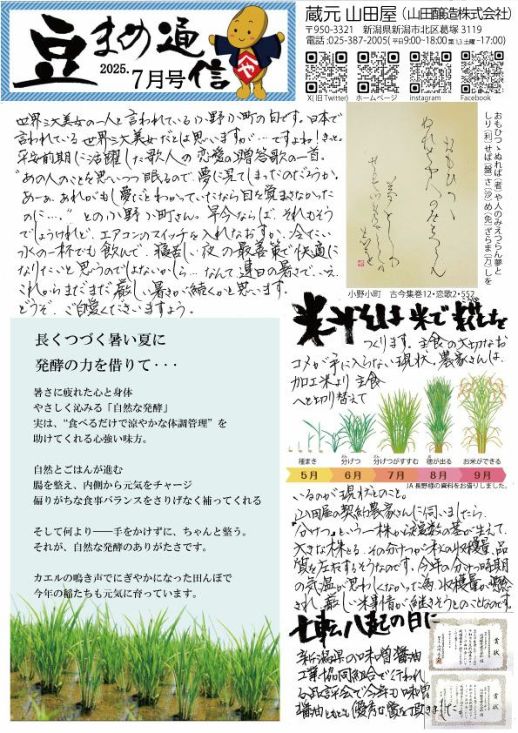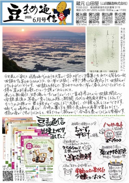 三代目が紡いだ「味噌通信」。お届けする商品に同梱していた山田屋のおたよりです。それを今に受け継いだ女将が「豆まめ通信」として、 山田屋の様子や、商品案内、使えるレシピの「豆まめ通信」に込めて、毎月更新しています。 バックナンバーから順次皆様にご紹介していきます。
